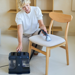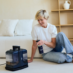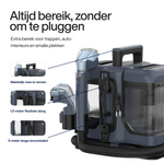 Je vult het reservoir, richt op de plek, drukt op de knop en ziet het vuil verdwijnen. De combinatie van sproeien en zuigen haalt het vuil tot diep in de vezels weg; zonder alles doorweekt achter te laten.